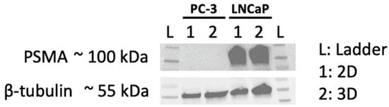 Whole cell lysates were prepared to assess the amount of prostate-specific membrane antigen (PSMA) in 2D and 3D cultures. Then, 2D and 3D lysate preparation as well as Western Blot were performed as described previously [].