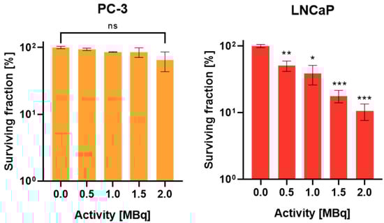 To further evaluate the reproductive potential of cells cultivated in monolayers, clonogenic assays were performed. Figure 2 depicts a significant decrease in the surviving fraction with increasing activity in PSMA+ (PSMA positive) LNCaP cells. In contrast, PSMA- (PSMA-negative) PC-3 cells showed no significant change in the surviving fraction over the range from 0 to 2 MBq [177Lu]Lu-PSMA-I&T treatment for 3 h.