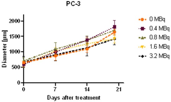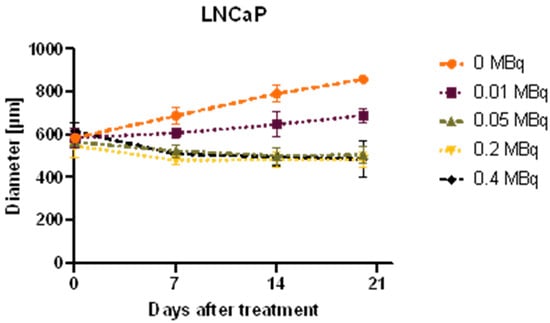 While PC-3 spheroids showed no significant difference in size compared to the control up to 3.2 MBq, significant growth inhibition was evident in LNCaP spheroids already at the lowest applied dose of 0.01 MBq. Treatment with 0.05 MBq [177Lu]Lu-PSMA-I&T showed a high treatment effect and was not significantly different to 0.2 or 0.4 MBq. Spheroid diameters 0, 7, 14, and 20 days after treatment are depicted in Figure 3. The spheroid shape and growth rate were cell line dependent. Time lapse images are given in the supplement (Supplementary Figure S2).