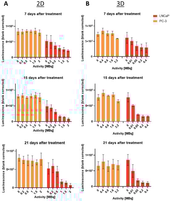 Cell viability assessment in 2D (A) and 3D (B) models of PC-3 and LNCaP cells on days 7, 15, and 21 after treatment, using Cell Titer Glo® 3D reagent. Plotted as mean ± standard deviation from three to four independent experiments (n = 3–4) in duplicates. Luminescence signal corresponds with viability. Note the differences in applied activity between 2D and 3D.