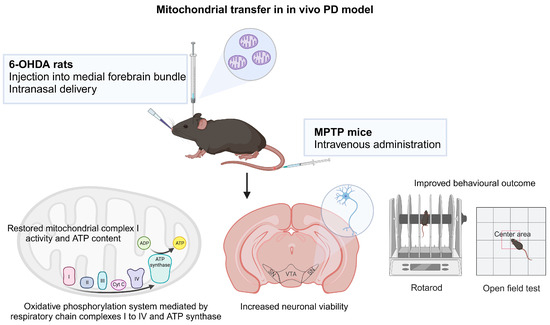 Mitochondrial transfer in PD. Mitochondrial treatment via intravenous administration in experimental MPTP mouse model and intranasal delivery and injection into medial forebrain bundle in 6-OHDA rat model resulted in mitochondrial function recovery, improved neuronal survival and better behavioral outcomes. The figure was created with BioRender.com, accessed on 30 November 2023.