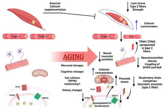 Calcium homeostasis and function in aging. With age, we see decreased lean tissue, known as sarcopenia, specifically loss of type 2 fast-twitch fibers. Calcium concentration has been seen to increase in aged muscle, with age-related denervation resulting in upregulated Tropomyosin 1/2 and Troponin C1/C2. Furthermore, denervation leads to decreased coupling on DHPR and RyR. An accumulation of mitochondrial dysfunction is also seen, with changes in calcium content, increased ROS, and changes in respiratory functions. This mitochondrial damage has been seen to cause declines in SERCA protein levels. Decreased SERCA levels and age-related loss of STIM1 promote dysregulated calcium homeostasis, leading to further cellular stress such as mitochondrial damage, DNA damage, and apoptosis/atrophy. In addition to musculature, there are whole-body changes with respect to calcium such as neuronal changes in calcium content with links to cognition decline, age-related calcium dysregulation correlated to neurodegenerative diseases, gut–mineral relationships, and changes in calcium uptake overall. Figure created with BioRender.com.