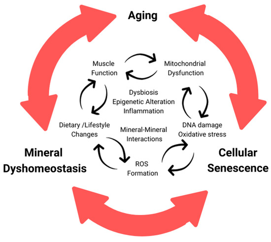 The essential micronutrient calcium serves many functions, and this review has focused on its role in muscle, aged muscle, and cellular senescence. We have observed various changes in regulatory mechanisms, some of which are altered while others remain constant. The review has also delved into the complex interactions between calcium and other minerals such as zinc and iron. Despite the focus on zinc and iron, it is critical to note that calcium has similarly intertwined relationships with many other metals, minerals, and compounds. Within cells, calcium regulation occurs in various organelles, including the ER/SR, mitochondria, and the nucleus, and these regulations can change with age, cell stress, or cellular senescence. Although many strides have been taken in recent years, there are still gaps in knowledge regarding the relationships with neurodegenerative diseases, specific muscles and their various fiber types, and novel mineral–mineral interactions. Some of these areas are currently under investigation, with ongoing human clinical trials of senolytics therapies and the adaptation of new methodologies such as improved calcium probes in mechanistic-focused studies. The dysregulation of mineral concentration in aging and cellular senescence may be driven by a cycle of dyshomeostasis. This cycle involves the underlying mechanisms of aging progressing towards inflammation and cellular senescence, leading to altered mineral concentrations and interactions. This further exacerbates the negative cycle, advancing aging and age-related diseases, not only in the muscle but also in various other tissues throughout the aging organism, as summarized in Figure 2.