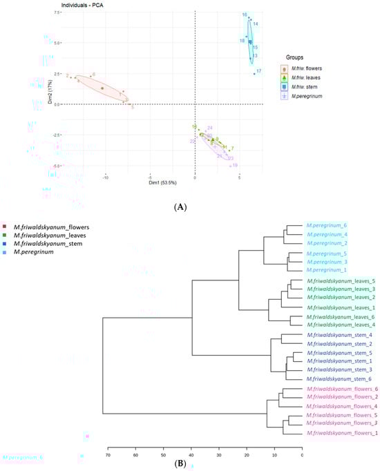 (A) Score plots of PCA based on the GC-MS analysis, using Ward’s clustering algorithm. The four samples are presented as follows: M. friwaldskyanum flowers—red circles, M. friwaldskyanum leaves—green triangles, M. friwaldskyanum stems—cyan squares and M. peregrinum—purple crosses. (B) Hierarchical cluster analysis (HCA) based on CG-MS analysis, using Ward’s clustering algorithm.