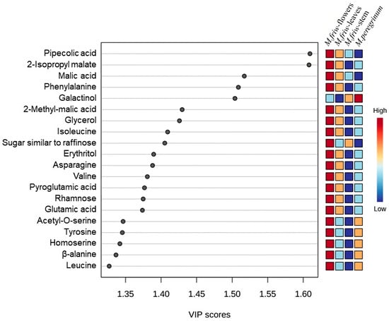 The results show that the M. friwaldskyanum flowers were clearly distinguishable from the rest of the samples mainly due to a high accumulation of amino acids. Leucine, β-alanine, homoserine, tyrosine, acetyl-O-serine, valine, asparagine, isoleucine and phenylalanine were among the amino acids strongly represented in M. friwaldskyanum flowers and contribute as important variables in comparison with the rest of the samples.