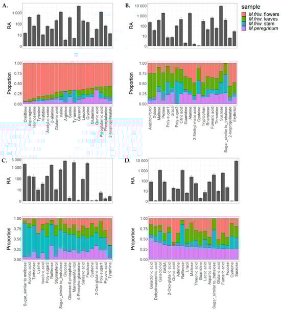 Top 20 primary metabolites’ tissue distribution in M. friwaldskyanum (A) flowers; (B) leaves; (C) stem; and (D) M. peregrinum. The four samples are presented as follows: M. friwaldskyanum flowers—red color, M. friwaldskyanum leaves—green color, M. friwaldskyanum stems—cyan color and M. peregrinum—purple color. The upper part of the figure represents the relative abundance (RA) of the top 20 primary metabolites in the respective tissues and the lower part shows their proportion, and distribution across the four sample types.