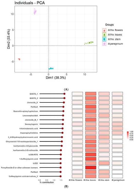 (A) PCA score plots based on UPLC-MS/MS analysis. The four samples are presented as follows: M. friwaldskyanum flowers—red circles, M. friwaldskyanum leaves—green triangles, M. friwaldskyanum stems—cyan squares and M. peregrinum—purple crosses. (B) Top 20 metabolites with highest contribution to PC1. (C) Top 20 metabolites with highest contribution to PC2. Abbreviations used for the compounds: Q3G7G—quercetin-3-O-(2″-O-apiosyl-6-O″-rhamnosyl)glucosidase; FerHex—feruloyl-hexoside; Is3G6R7G—isorhamnetin-3-O-(6″-O-rhamnosyl)glucoside; Is3G2—isorhamnetin-3-O-(2″-O-apiosyl)glucoside; KGRApCou—kaempferol-3-O-Glc-2″-O-Api-6″-O-Rha-pCou-7-O-Glc).