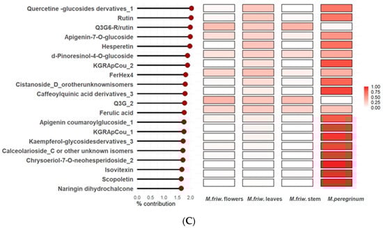 PCA analysis clearly identified four different classes of samples which displayed their unique biochemical composition (Figure 4A). Interestingly, while the primary metabolite composition of M. friwaldskyanum leaves and M. peregrinum were identical and clustered together, in terms of their secondary metabolome, they differed very much, and this is easily seen in Figure 4B,C, where the top 20 metabolites with the highest contribution to PC1 and PC2, respectively, are given. The differentiation between the samples was mainly due to the flavonoid derivatives.