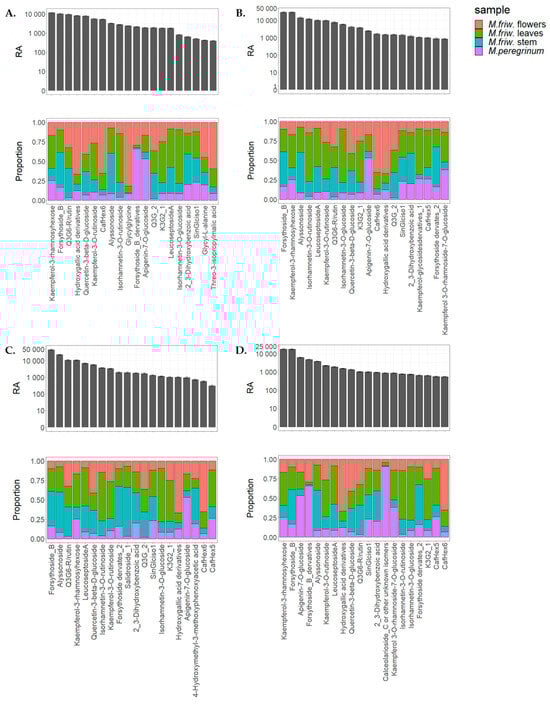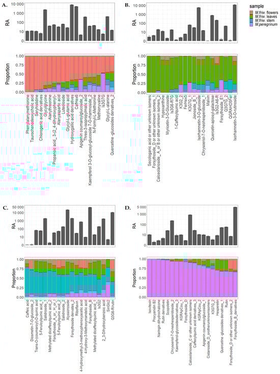 Secondary metabolites’ tissue-specific distribution in M. friwaldskyanum: (A) flowers; (B) leaves; (C) stem; (D) M. peregrinum. The four samples are presented as follows: M. friwaldskyanum flowers—red color, M. friwaldskyanum leaves—green color, M. friwaldskyanum stems—cyan color and M. peregrinum—purple color. The upper part of the figure represents the relative abundance (RA) of the top 20 secondary metabolites in the respective tissues and the lower part shows their distribution across the four sample types, where 1 is the sum of signals from the four samples.