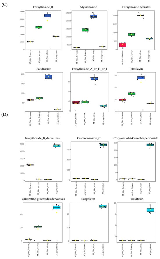 The most prominent metabolites in M. friwaldskyanum (A) flowers; (B) leaves; (C) stem; in (D) M. peregrinum. The y-axes represent the range of the relative abundances for each of the selected metabolites across all sample types.
