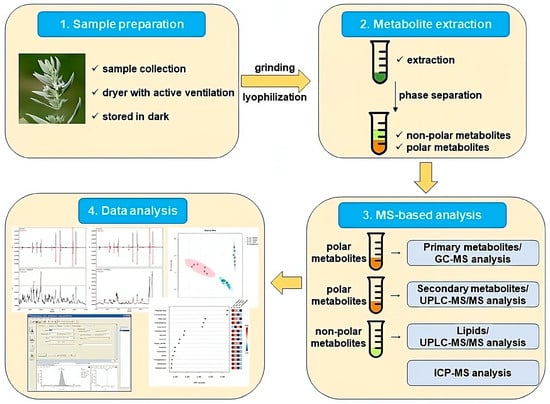 - Xiao, Q.; Mu, X.; Liu, J.; Li, B.; Liu, H.; Zhang, B.; Xiao, P. Plant Metabolomics: A New Strategy and Tool for Quality Evaluation of Chinese Medicinal Materials. Chin. Med. 2022, 17, 45. [Google Scholar] [CrossRef] [PubMed]