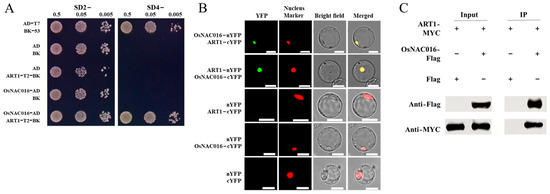 A previous study showed that ART1 can transcriptionally activate target genes within yeast. Truncation analysis indicated that its activation domain resides within its C terminus (176–466 aa). To probe the molecular mechanism of ART1 activation by Al, we utilized truncated ART1 (1–175 aa) lacking an activation domain as bait to screen for ART1-interacting proteins via yeast two-hybrid (Y2H) assay and identified eight candidate proteins (Figure 1A; Supplemental Figure S1A,B; Table S1). As several NAC TFs were reported to be involved in regulating Al tolerance in plants [22,23], we selected a NAC TF OsNAC016 (LOC_Os01g01430) for further functional analysis. OsNAC016 encodes a 340-amino-acid protein harboring an NAM domain at its N terminus. To verify a physical association between OsNAC016 and ART1, we conducted a bimolecular fluorescence complementation (BiFC) assessment in rice protoplast cells. We observed the YFP signal in rice protoplasts co-expressing OsNAC016-nYFP and ART1-cYFP or ART1-nYFP and OsNAC016-cYFP, but not in those co-expressing control constructs. Furthermore, YFP signal nicely overlapped with the RFP signal of the nuclear marker Ghd7 [25] (Figure 1B), confirming in vivo interaction of OsNAC016 and ART1 at the nucleus. We also performed co-immunoprecipitation (Co-IP) experiment in N. benthamiana leaves co-expressing MYC-tagged OsNAC016 and FLAG-tagged ART1 and found that OsNAC016 was coimmunoprecipitated with ART1 in planta (Figure 1C). Taken together, the aforementioned evidence indicated the binding of OsNAC016 to ART1 within the nuclear compartment of plant cells.