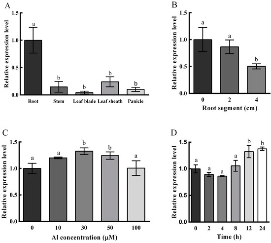 QRT-PCR assessment was utilized to determine the OsNAC016 expression within roots, stems, leaf blades, leaf sheaths and panicles. OsNAC016 was primarily expressed in roots (Figure 2A), and its expression was higher in the root tip (0–1 cm) than in the mature root segments (1–2 and 2–3 cm) (Figure 2B). Dose-reliant and time course assessments revealed that the root OsNAC016 expression was weakly up-regulated by Al treatments (Figure 2C,D).