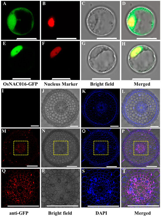 To determine the OsNAC016 cell-specific localization in rice roots, we conducted immunostaining of the transgenic rice expressing the ProOsNAC016:OsNAC016-GFP construct. GFP antibody co-staining with a nuclear stain DAPI revealed that red fluorescence was merged with the blue DAPI fluorescence in all the root cell layers (Figure 3M–T). No red fluorescence was evident in the WT root (Figure 3I–L). These results indicated that OsNAC016 locates to the nucleus of all root cells.
