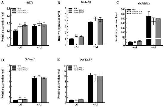 Effect of knockout of OsNAC016 on the expression of ART1 and some ART1-regulated genes in roots. ART1 (A), OsALS1 (B), OsFRDL4 (C), OsNrat1 (D), OsSTAR1 (E). Both wild-type rice and two OsNAC016-knockout lines were exposed to 0 or 50 µM Al for 8 h. Histone H3 was used as an internal standard. Data are means ± SD (n = 3). Asterisks indicate significant differences between WT and the knockout lines (Tukey’s test, ** p < 0.01, * p < 0.05).