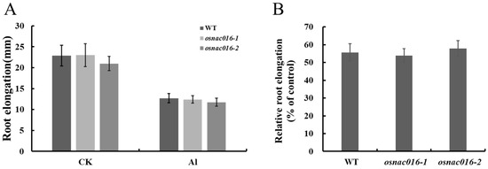 Sensitivity analysis of OsNAC016-knockout lines to Al. (A) Effect of Al on root length. (B) Effect of Al on root elongation. Five-day-old seedlings of the WT and two OsNAC016-knockout lines were exposed to a 0.5 mM CaCl2 solution, pH 4.5, containing 0 or 50 μM Al for 24 h. Root length was measured before and after the treatment. Relative root elongation refers to (root elongation with Al)/(root elongation without Al) × 100. Data are means ± SD (n = 8).