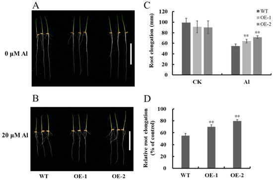 Al sensitivity of the WT and OsNAC016-overexpressing lines. (A,B) Phenotypes of the WT and OsNAC016-overexpressing lines after the treatment with 0 (A) and 20 μM Al (B). (C) Effect of Al on root length. (D) Effect of Al on root elongation. Germinated seeds of each line were exposed to a 0.5 mM CaCl2 solution (pH 4.5) containing 0 or 20 μM Al for 5 d. Scale bar = 5 cm. Root length was measured before and after the treatment. Relative root elongation refers to (root elongation with Al)/(root elongation without Al) × 100. Data are means ± SD of biological replication (n = 8). Asterisks indicates significant differences (p < 0.01, Tukey’s test).