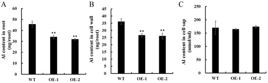 Moreover, we compared the root Al levels within WT rice and two OsNAC016-overexpressing lines. After a short-term (8 h) treatment with 50 μM Al, Al levels within roots and the cell walls within root tips (0 to 1 cm from the apex) were drastically reduced in the overexpression lines, relative to the WT (Figure 7A,B). However, Al concentration within root cell sap among all lines was comparable (Figure 7C). Collectively, this suggested that OsNAC016 overexpression reduces Al accumulation within root tip cell walls.