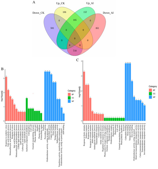 Transcriptome analysis of OsNAC016-regulated genes. (A): Venn diagram of the numbers of OsNAC016-regulated genes in the OE and WT lines. UP_CK: the up-regulated genes in the OE compared with the WT under normal conditions (fold-change > 2). UP_Al: the up-regulated genes in the OE compared with the WT under Al treatments (fold-change > 2). DOWN_Al: the down-regulated genes in the OE compared with the WT under Al treatments (fold-change < 0.5). DOWN_CK: the down-regulated genes in the OE compared with the WT under normal conditions (fold-change < 0.5). (B,C) Classification of up-regulated genes (B) and down-regulated genes (C) in OE line compared with the WT under Al treatments. BP: biological process. CC: cellular component. MF: molecular function. Number represents the numbers of the genes. Three biological replicates (n = 3) were performed for each treatment.