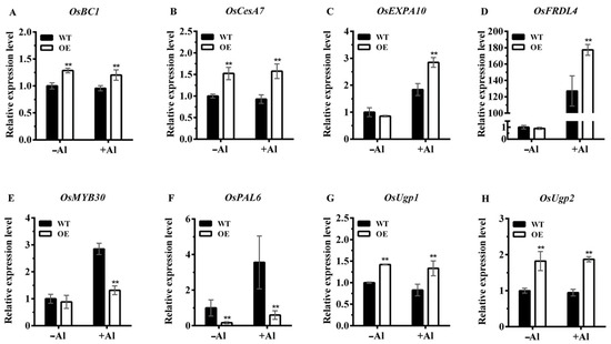 The expression level of eight candidate DEGs in WT and OE (OsNAC016 overexpression) roots under normal conditions and Al treatments. OsBC1 (A), OsCesA7 (B), OsEXPA10 (C), OsFRDL4 (D), OsMYB30 (E), OsPAL6 (F), OsUgp1 (G), OsUgp2 (H). −Al represents WT and OE lines under normal conditions. +Al represents WT and OE lines under Al treatment conditions (0.5 mM CaCl2, 40 μM AlCl3, pH = 4.5) for 8 h. Histone H3 was used as an internal standard. Data are means ± SD (n = 3). Asterisks indicates significant differences (p < 0.01, Tukey’s test).