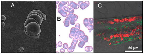 (A,B): Images of RBC rouleaux (stacked clumps) from the blood of COVID-19 patients, obtained using electron (magnification ×5000) [106] and light (80× objective) [107] microscopy. The first study (A) found RBC clumps in all 31 patients studied, all with mild COVID-19 [106], and the second (B) found large RBC aggregates in 85% of COVID-19 patients with anemia [107]. (C): A frame from a video of RBC aggregates in capillaries of zebrafish embryos that formed within 3–5 min after injection of SARS-CoV-2 SP into the common cardinal vein at a similar concentration to that obtained in critically ill COVID-19 patients [103]. The velocity of blood flow in the capillaries shown in this video frame was markedly reduced from that prior to injection of SP. Reproduced (A) with permission from Georg Thieme Verlag KG; (B) under CC-BY 4.0; (C) with permission from Elsevier.