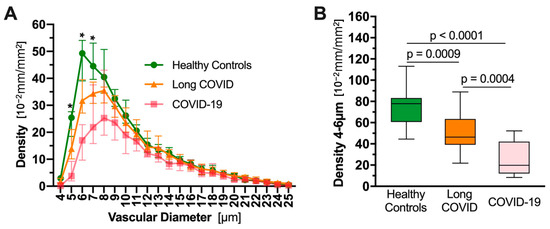 Another effect of experimentally induced RBC aggregation, the redistribution of blood flow from microvessels to blood vessels of larger cross-sectional diameter, as described above, is also paralleled in COVID-19 is. Osiaevi et al. (2023) compared videomicroscopic imaging of the sublingual microvasculature of 16 critically ill COVID-19 patients, 17 patients with long COVID and 15 healthy controls [203]. As shown in Figure 4, the density of functional capillaries (having flowing RBC content ≥ 50%) with cross-sectional diameter 4–10 μm was sharply reduced for active COVID-19 patients vs. controls, with values for long COVID patients roughly halfway between those for active COVID-19 patients and healthy controls. The study investigators concluded from these and other measures of microvascular health that the long COVID patients had significant microvasculature impairment, lasting even 18 months after infection for some [203].