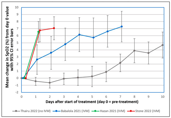 Mean changes in oxygen saturation (SpO2) for severe COVID-19 patients following treatments including or excluding IVM. Reproduced from Stone et al. (2022) [318] (CC-BY 4.0). Patients tracked over various time periods from each regimen were those with SpO2 values all recorded on room air, having pre-treatment (day 0) values ≤ 93%. The y-axis value at day n is the mean of changes in SpO2 values from day 0 to day n, with error bars designating 95% confidence intervals. ● Thairu et al. (2022) [321,322]: 26 patients, median age 45 years, treated with different combinations of lopinavir/ritonavir (Alluvia), remdesivir, azithromycin and enoxaparin as well as zinc sulfate and vitamin C. ● Stone et al. (2022) [318]: 34 patients, median age 56.5, treated with IVM, doxycycline and zinc. ● Hazan et al. (2021) [319]: 19 patients, median age 63, treated with IVM, doxycycline and zinc. ● Babalola et al. (2021) [320,321]: 19 patients, median age 33, treated with IVM, zinc and vitamin C, with some also given azithromycin and hydroxychloroquine.