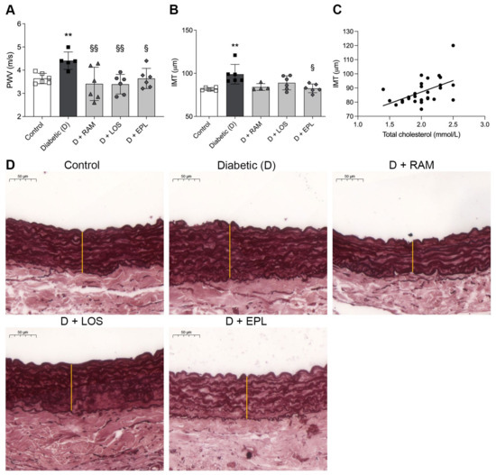 Pulse wave velocity (PWV) and aortic intima–media thickening (IMT) of control, diabetic (D), ramipril (D + RAM)-treated, losartan (D + LOS)-treated, or eplerenone (D + EPL)-treated diabetic rats: (A) evaluation of PWV; (B) the quantitative evaluation of IMT; (C) aortic IMT strongly correlates with serum total cholesterol level (R2 = 0.2532, p = 0.0064); (D) representative Orcein-stained aorta sections. Elastic fibers are stained brown after Orcein staining. They are visualized as either thin fibers or elastic lamella. Original magnification, ×40. Scale bar: 50 μm. Bars indicate means ± SDs. ** p < 0.01 vs. control, § p < 0.05 vs. diabetic, §§ p < 0.001 vs. diabetic (n = 6/group).