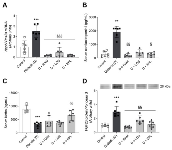 Specific biomarkers of myocardial injury of control, diabetic (D), ramipril (D + RAM)-treated, losartan (D + LOS)-treated, or eplerenone (D + EPL)-treated diabetic rats: (A) mRNA expressions of B-type natriuretic peptide (Nppb). mRNA expressions were normalized to Rn18S mRNA expression; (B) the quantitative evaluation of serum cardiac troponin I level; (C) the quantitative evaluation of serum Klotho levels; (D) protein levels of fibroblast growth factor 23 (FGF23). Proteins were normalized to total protein using Ponceau S staining as loading control. Bars indicate means ± SDs. ** p < 0.01 vs. control, *** p < 0.001 vs. control, §§ p < 0.01 vs. diabetic, §§§ p < 0.001 vs. diabetic (n = 6/group), § p < 0.05.