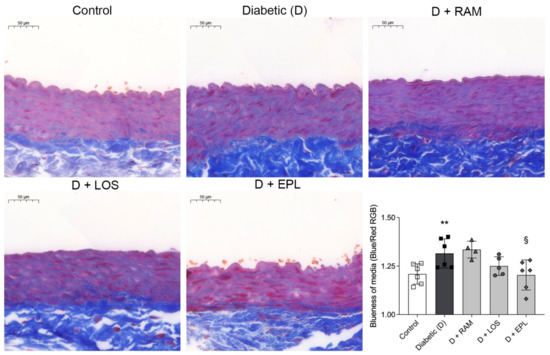 Representative Masson’s trichrome stained aorta sections and quantitative evaluation of fibrosis of control, diabetic (D), ramipril (D + RAM)-treated, losartan (D + LOS)-treated, or eplerenone (D + EPL)-treated diabetic rats. Original magnification, ×40. Scale bar: 50 μm. Bars indicate means ± SDs. ** p < 0.01 vs. control, § p < 0.05 vs. diabetic (n = 6/group).