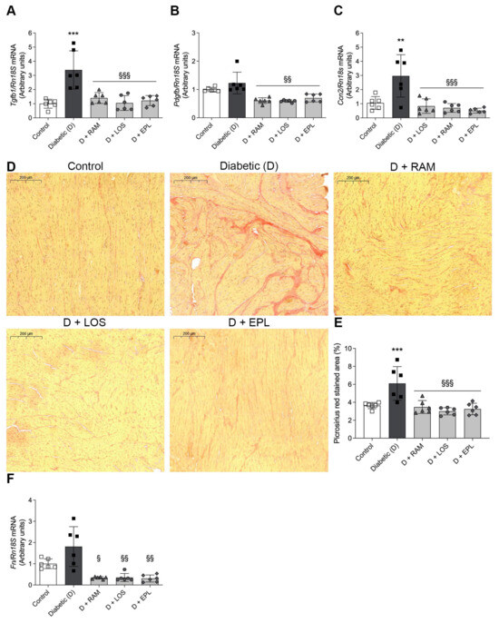 RAASi attenuate fibrosis in the left ventricle of diabetic rats. (A–C) mRNA expression of transforming growth factor β (Tgfb1), platelet-derived growth factor (Pdgfb), and connective tissue growth factor (Ccn2) of control, diabetic (D), ramipril (D + RAM)-treated, losartan (D + LOS)-treated, or eplerenone (D + EPL)-treated diabetic rats. (D,E) Representative picrosirius red stained left ventricular sections and quantitative evaluation of collagen accumulation. The red-stained area was measured based on the red color intensity. The myocardial field of measurement was manually selected taking caution to avoid the endocardium and perivascular connective tissue. Original magnification, ×200. Scale bar, 200 μm. (F) mRNA expression of fibronectin (Fn). mRNA expressions were normalized to Rn18S mRNA expression. Bars indicate means ± SDs. ** p < 0.01 vs. control, *** p < 0.001 vs. control, § p < 0.05 vs. diabetic §§ p < 0.01 vs. diabetic, §§§ p < 0.001 vs. diabetic (n = 6/group).