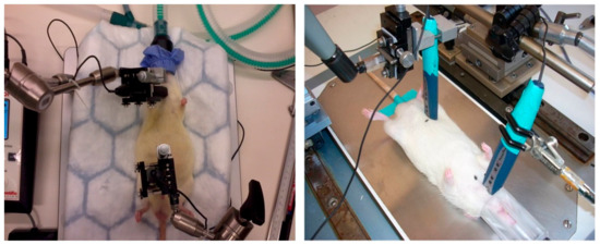 After two weeks of treatment, PWV and blood pressure were measured under isoflurane (1.5% maintenance after 4% induction concentration, Ghislandi es Tarsai Kft., Budapest, Hungary) anesthesia on a 37 °C heating pad. Systolic and diastolic blood pressure were non-invasively measured on a tail vein, and the mean arterial pressure (MAP) was calculated using the CODA tail cuff standard monitor system (EMKA Technologies, Paris, France), which utilizes clinically validated volume pressure recording technology. Non-invasive PWV registration was performed using PulsePenLab applanation tonometry device (DiaTecne, Milan, Italy), simultaneously recording the electrocardiogram. The pulse wave was detected over the carotid and femoral arteries on the same side. A high-precision digital caliper was used to measure the direct distance from the carotid point and the peripheral point of application of the tonometric probes. The time difference between the two waves was divided by 80% of the direct carotid–femoral surface distance to calculate the PWV (Figure 5) [69].