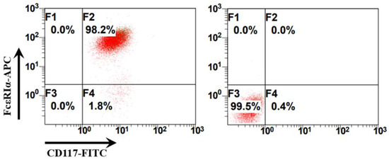 Identification of bone marrow-derived mast cells (BMMCs) using flow cytometry. The right panel presents the results of the isotype control antibodies. Allophycocyanin (APC) Armenian Hamster IgG isotype control antibodies (BioLegend, San Diego, CA, USA) and fluorescein isothiocyanate (FITC) Rat IgG2b, κ isotype control antibodies were used as isotype controls (BioLegend, San Diego, CA, USA). The left panel presents the results of the BMMCs labeled with APC Armenian Hamster anti-mouse FcεRIα antibodies (IgG) and FITC Rat anti-mouse CD117 (c-Kit) (IgG2b, κ) antibodies and identified using flow cytometry.