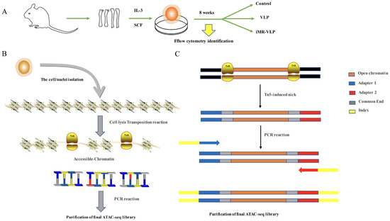 The cell viability of the BMMCs was identified, and ATAC-seq library preparations were carried out as previously reported [21]. The detailed schematic of the cell preparation and library construction is shown in Figure 1. Briefly, the BMMCs were washed with phosphate-buffered saline (PBS) after centrifugation, and then the cells were lysed using a cold lysis buffer and centrifuged again. The nuclei pellet was resuspended in the Tn5 transposase reaction mixture and incubated for 30 min at 37 °C. Subsequently, the DNA product was purified using a Qiagen MinElute Purification Kit (Shenzhen, China). Equimolar Adapter 1 and Adapter 2 were added after the transposition, and the genes were then amplified for the full library. After the PCR amplification, the libraries were purified with the AMPure beads, and the quality of the libraries was assessed with Qubit. The clustering of the index-coded samples was performed on a cBot Cluster Generation System with a TruSeq PE Cluster Kit v3-cBot-HS (Illumina, San Diego, CA, USA) according to the manufacturer’s instructions. The library preparations were then sequenced on an Illumina Hiseq platform, and 150 bp paired-end reads were generated. The ATAC-seq analysis was carried out at Novogene (Tianjin, China) with two biological replicates per group.