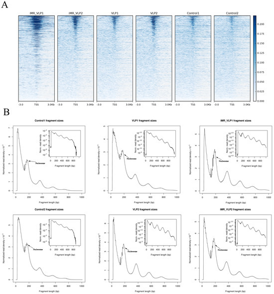 We used Burrows Wheeler Aligner for a comparative analysis between the ATAC-seq dataset and mouse reference genomes. We evaluated the ATAC-seq dataset with several common statistical methods (Table 1). For each sample, an average of 50 million clean reads were obtained. The data for Unique_Mapped (the number of reads with unique mapped positions in the reference sequence) suggested that the library complexity was >65.72% in the VLP group, >71.59% in the inhibited mannose receptor (iMR-VLP) group, and >82.61% in the control group. Considering that there may be multiple reads at a specific position, the number of reads excluding multiple Unique_mapped reads (Unique_mapped_dedup) showed >50.30% in the VLP group, and >55.01% in the iMR-VLP group. The Unique_mapped_dedup reads were used for further analysis. The accessible regions were successfully detected by the observation of a strong enrichment of ATAC-seq reads around the transcription start sites (TSSs, ±3 kb) (Figure 3A). Additionally, all ATAC-seq libraries yielded the expected distribution of fragment lengths. Most fragments were small, representing internucleosome open chromatin; and only a few fragments were large, spanning the nucleosome (Figure 3B). Taken together, these results demonstrated that the ATAC-seq data were acceptable.