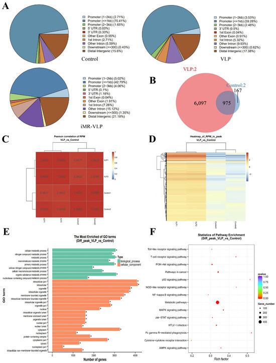 Approximately 6097 accessible peaks were VLP-specific, and 975 overlapped with the accessible peaks observed when the BMMCs were inoculated with VLPs (Figure 4B). A heatmap clustering analysis of the Pearson correlation coefficients from the comparison of four datasets (two biological replicates of the control group and the VLP group) revealed a strong correlation between the replicates (Figure 4C). Compared with the control group, most peaks in the VLP group were specific and upregulated (Figure 4D). A gene ontology analysis showed that the accessibility of chromatin regions containing genes related to biological processes and cell components differed greatly between the groups. Compared with the control group, approximately 16,000 related peaks were upregulated, and about 2300 related peaks were downregulated in the VLP group (Figure 4E). A pathway enrichment analysis showed that the peaks associated with the NF-κB, MAPK, PI3K-Akt, and other signaling pathways were upregulated in the VLP group, compared with the control group (Figure 4F).
