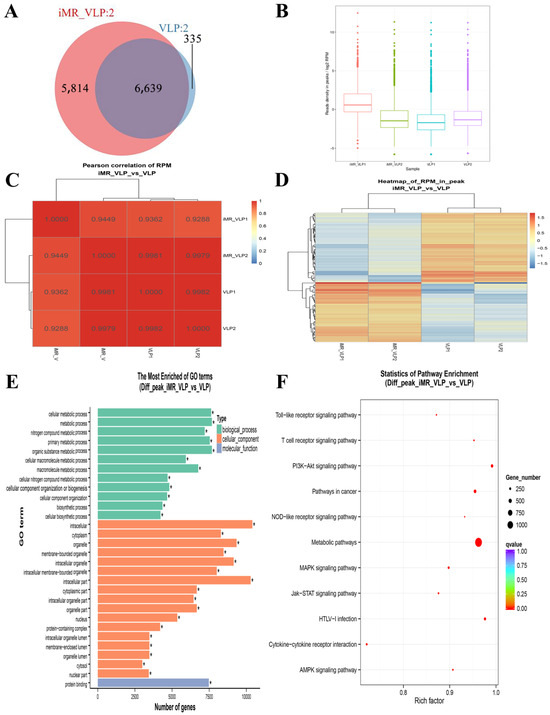 Properties of accessible chromatin regions identified in BMMCs incubated with foot-and-mouth disease virus-like particles (FMDV-VLPs). (A) Pie charts showing the distribution of accessible regions identified from the ATAC-seq results using ChIPseeker software (version 1.16.1) in each functional area. (B) Venn diagram showing an overlap of differential peak linkages identified in VLP versus control data. (C) Heatmap clustering of correlation coefficients across four replicates. (D) Hierarchical clustering heat map showing differential peaks in different samples. (E) The most enriched gene ontology terms for differential peaks from BMMCs in VLP vs. control samples. * p < 0.05. (F) Kyoto Encyclopedia of Genes and Genomes (KEGG) analysis of different peaks from BMMCs in VLP vs. control samples.