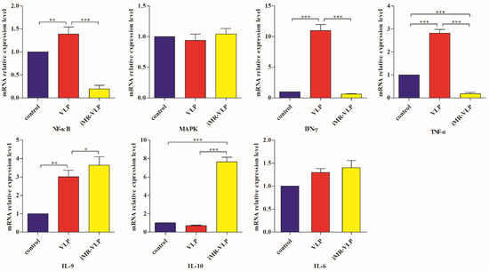 To further verify the expression levels of critical cytokine genes, BMMCs samples were divided into the three groups as described above (the iMR-VLP group, the VLP group, and the control group). The total RNA was extracted with TransZol Up (TransGen, Beijing, China), followed by reverse transcription with the M-MLV reverse transcriptase (Promega, Beijing, China) to obtain the cDNA. Subsequently, the cDNA was utilized to amplify the critical genes with three-step RT-qPCR tests. The primers were designed according to the coding sequence (CDS) of the following genes: NF-κB (AY388959), MAPK (X58712), TNF-α (BC137720), IFN-γ (BC119063), IL-9 (NM_008373), and IL-10 (M37897). The qPCR reaction mixture comprised 10 μL PerfectStart Green qPCR SuperMix (TransGen, Beijing, China), 1 μL of 10 μM forward/reverse primers, 2 μL of cDNA, and a volume of ddH2O to obtain a final volume of 20 μL. The details of primers used in this study are listed in Table 4.