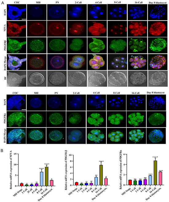 Protein expression and mRNA expression of NFYA, PDGFRβ, and PDGFRα during bovine embryonic development. (A) Immunofluorescent expression of NFYA, PDGFRβ, and PDGFRα from COCs to day-8 blastocyst stage. (B) Relative mRNA expression of NFYA, PDGFRβ, and PDGFRα from MII to day-8 blastocyst stage. Data are presented as the mean ± SEM. For immunofluorescent staining, COCs/MII stage oocytes/zygotes/two cell/four cell/8-cell/16-cell-stage embryos and day 8 blastocysts, 20 per group, were used. For mRNA expression analysis, MII stage oocytes/zygotes/two-cell/four-cell-stage embryos, 20 per group; 8-cell and 16-cell embryos, 15 per group, and 6 blastocysts per group were used in triplicates. The experiments were repeated three times. Scale bar: 20 µm. ns = not significant. * p < 0.05, ** p < 0.01, *** p < 0.001, and **** p < 0.0001 denote significant differences; SEM—standard error of mean. BF = Bright Field.