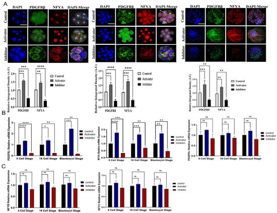 NFYA nuclear localization via PDGFRβ activation. (A). Relative mRNA expression of MAPK1 and AKT in control, activator, and inhibitor groups. (B). Relative mRNA expression of JAK2 and STAT3. (C) Relative mRNA expression of CIITA, CREB in control, activator, and inhibitor groups. For mRNA analysis, 8-cell and 16-cell embryos, 15 per group, and 6 blastocysts per group were used in triplicates. The experiments were repeated three times. Data are shown as the mean ± SEM. * p < 0.05, ** p < 0.01, *** p < 0.001, and **** p < 0.0001 denotes significant differences. SEM—standard error of mean.