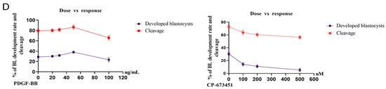 Experiment 2 was conducted similarly to the experiment 1. The specific inhibitor CP-673451 (cat. # S 1536) was added at different concentrations (0 (control group), 100, 200, and 500 nM) to the IVC medium. Following comparison with the control group, 100 nM was determined to be the lowest effective concentration based on the blastocyst developmental rate. Five biological replicates were used to determine the optimal (effective) concentrations. After determining the optimal concentration of the inhibitor, all the experimental procedures were identical to those performed in the PDGFRβ activation.