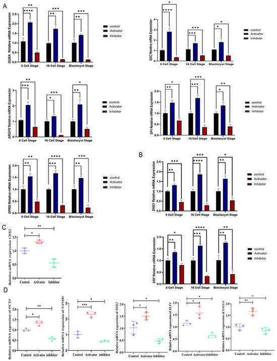 PDGFRβ and NFYA have been linked to zygotic genome activation. (A) Relative mRNA expression of zygotic genome activation related to DUXA, GSC, ARGFX, SP1, and DPRX genes in the control, activator, and inhibitor groups. (B) Relative mRNA expression of SRF and ZXH1 in control, activator, and inhibitor groups. (C) Relative mRNA expression levels of trophoblast-related CDX2. (D) Relative mRNA expression levels of OCT4, NANOG, SOX2, KLF4, and SALL4 pluripotency-related genes. Data are shown as the mean ± SEM. For mRNA analysis, 8-cell and 16-cell embryos, 15 per group, and 6 blastocysts per group were used in triplicates. ns = not significant. * p < 0.05, ** p < 0.01, *** p < 0.001, and **** p < 0.0001 denote significant differences. SEM—standard error of mean.