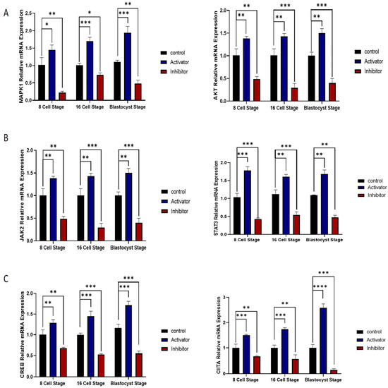 To analyze the PDGFRβ-linked NFYA nuclear localization, we examined NFYA protein expression via immunofluorescence. The results showed that PDGFRβ activation significantly (p < 0.05) enhanced NFYA nuclear localization in 8- and 16-cell stages and day-8 bovine blastocysts, compared to the control and PDGFRβ inhibition group (Figure 2A). The above result suggests that downstream signaling of PDGFRβ activates the NFYA. We first examined the MAPK1/AKT pathway. Gene expression analysis showed that MAPK1 and AKT were significantly (p < 0.05) upregulated in the PDGFRβ activator group (Figure 4A). Furthermore, we examined another most prominent JAK/STAT downstream pathway of the PDGFRβ receptor. The mRNA expression of JAK2 significantly (p < 0.05) showed enhancement while upregulating the STAT3 mRNA expression in the PDGFRβ activator group compared to the control and inhibitor groups (Figure 4B). Furthermore, we also examined transcription factors that have interacted and linked with NFYA, such as CIITA and CREB. The mRNA expressions of the CIITA and CREB were significantly (p < 0.05) higher in the PDGFRβ activator group (Figure 4C).
