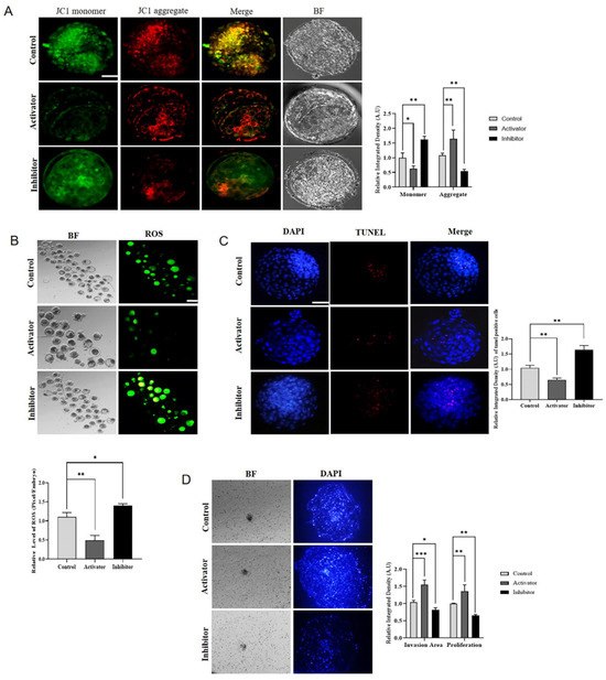 The mitochondrial genome is activated after minor embryonic genome activation and plays an important role in the full flag activation of EGA. We examined mitochondrial biogenesis in PDGFRβ activator and inhibitor-treated bovine embryos. PDGFRβ-linked differential NFYA expression significantly (p < 0.05) regulates mitochondrial membrane potential (Figure 5A). In comparison to the control and inhibitor groups, the activator group had a significantly (p < 0.05) higher number of mitochondrial aggregates. Furthermore, ROS and mitochondrial apoptosis levels were also significantly (p < 0.05) decreased in the PDGFRβ activator group compared with the control and inhibitor groups (Figure 5B,C). Next, we examined the importance of NFYA in embryo implantation using an invasion assay. A comparison of the activator group with the control and inhibitor groups showed that the invasion area and proliferation of implanted blastocysts were significantly (p < 0.05) higher in the activator group (Figure 5D). These results showed that PDGFRβ activation and inhibition significantly (p < 0.05) affected apoptosis and embryonic cell numbers.