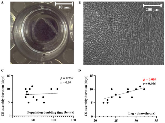 Cell sheets’ morphology and correlation of cultural characteristics with assembly duration. Macroscopic photo of CS after partial detachment from a 12-well plate (A) and representative micrograph of CS from human adipose tissue MSC (B) demonstrating cell morphology (phase-contrast microscopy). Dotted plots represent Pearson correlations of CS assembly duration with population doubling time (C) and lag-phase (D) after seeding. Individual data points and trend-line are plotted.