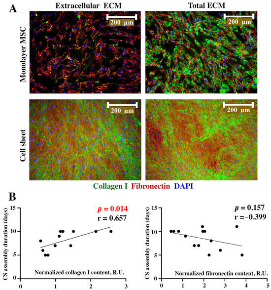 The collagen I and fibronectin contents assayed in the monolayer MSC cultures demonstrated opposite correlations with the duration of CS assembly (Figure 3). However, only a direct correlation for collagen I and assembly duration reached statistical significance (Figure 3). Our data in permeabilized monolayer cultures (Figure 3A) indicated that collagen I was deposited mainly inside MSCs, while fibronectin was secreted and detected in the extracellular compartment. This partially explained the results of the correlative semi-quantitative analysis. Indeed, it relied on dot-ELISA in lysates, so it failed to discern between intra- and extracellular compartments, detecting the total collagen I in the samples. However, this does not diminish the importance of using collagen I contents in monolayer MSCs as a predictive marker of long- or short-term CS assembly.
