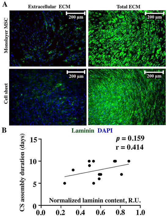 Immunofluorescent labeling of laminin in monolayer MSCs or CSs (A) and corresponding Pearson correlation analysis (B) of laminin contents in MSC monolayer and duration of CS assembly. Individual data points and trend-line are plotted. R.U.—relative units.