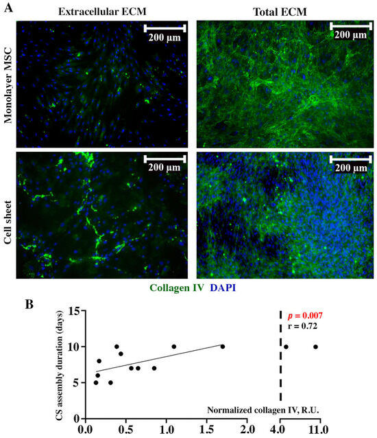 The collagen IV signal in the extracellular compartment of monolayer MSCs showed a low intensity with an increase in detachable CSs (Figure 5A, “Extracellular ECM”). After permeabilization, we observed a visible accumulation of collagen IV inside the cells in both monolayers and CSs, which suggested a peculiarly common profile of deposition for two collagens—type IV and type I—in monolayer culture characterized by intracellular accumulation and a drastic increase in its amount once CSs are formed (“Total ECM” in Figure 5A and Figure 3A, respectively). The dot-ELISA results demonstrated a direct correlation (r = 0.72; p = 0.007) of collagen IV relative contents with CS assembly duration, indicating that MSCs with a high production of this ECM component took longer to form a CS (Figure 5B).