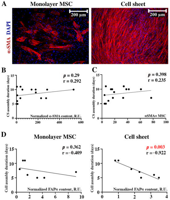 Evaluation of myofibroblast prevalence and FAP-α content in CS assembly duration. Immunofluorescent labeling of α-SMA in monolayer MSCs and CSs (A). Correlation of α-SMA contents (B) or myofibroblast counts (C) in monolayer MSC sand CS assembly duration. Impact of FAP-α was detectable (n = 7) as an inverse correlation only in assembled CSs (D), while in monolayer MSCs, it failed to reach statistical significance (dotted plots represent Pearson’s correlations). Individual data points and trend-line are plotted. R.U.—relative units.