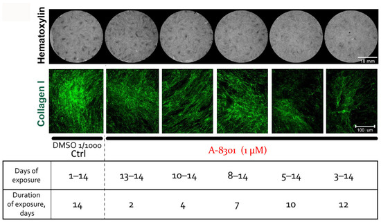 To understand the potential mechanism behind CS maturation and ECM accumulation, we used A-8301 (Sigma-Aldrich, USA)—a potent inhibitor of TGF-β type I receptor at 1 μM. We added it at different time-points to provide the inhibitory impact of short- or long-term duration and, on day 14, we found a time-dependent impairment in cellular mass accumulation (Figure 7, “Hematoxylin”) and collagen I deposition in the extracellular compartment of the CSs (Figure 7, “Collagen I”).